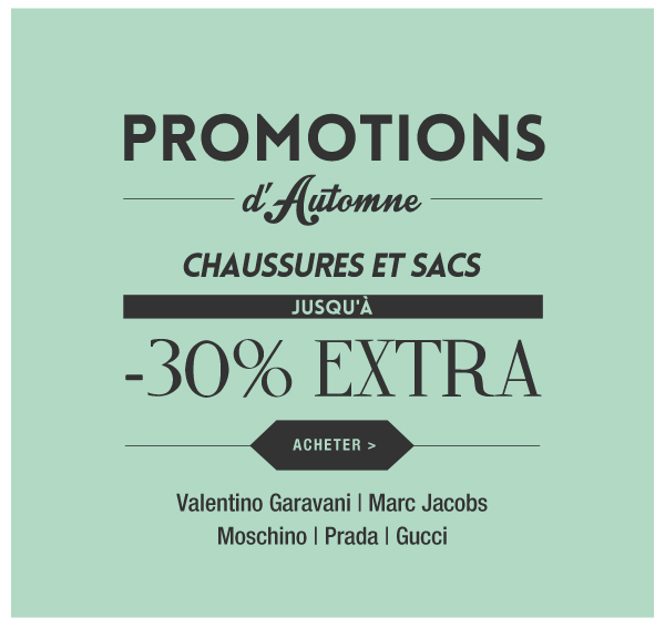 Jusqu'à -30% EXTRA sur les chaussures et les sacs. Promotions d'automne.
