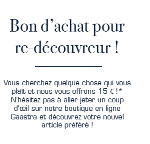 * Code: VIPFR7715. Vous pouvez que utiliser dans la Gaastra Boutique en ligne. Valable jusqu’au 05.04.2015. Valable pour toute la gamme en ligne, à partir des commandes de 119 €. Non cumulable avec d'autres promotions et coupons et non pour l'achat de certificats-cadeaux utilisables.